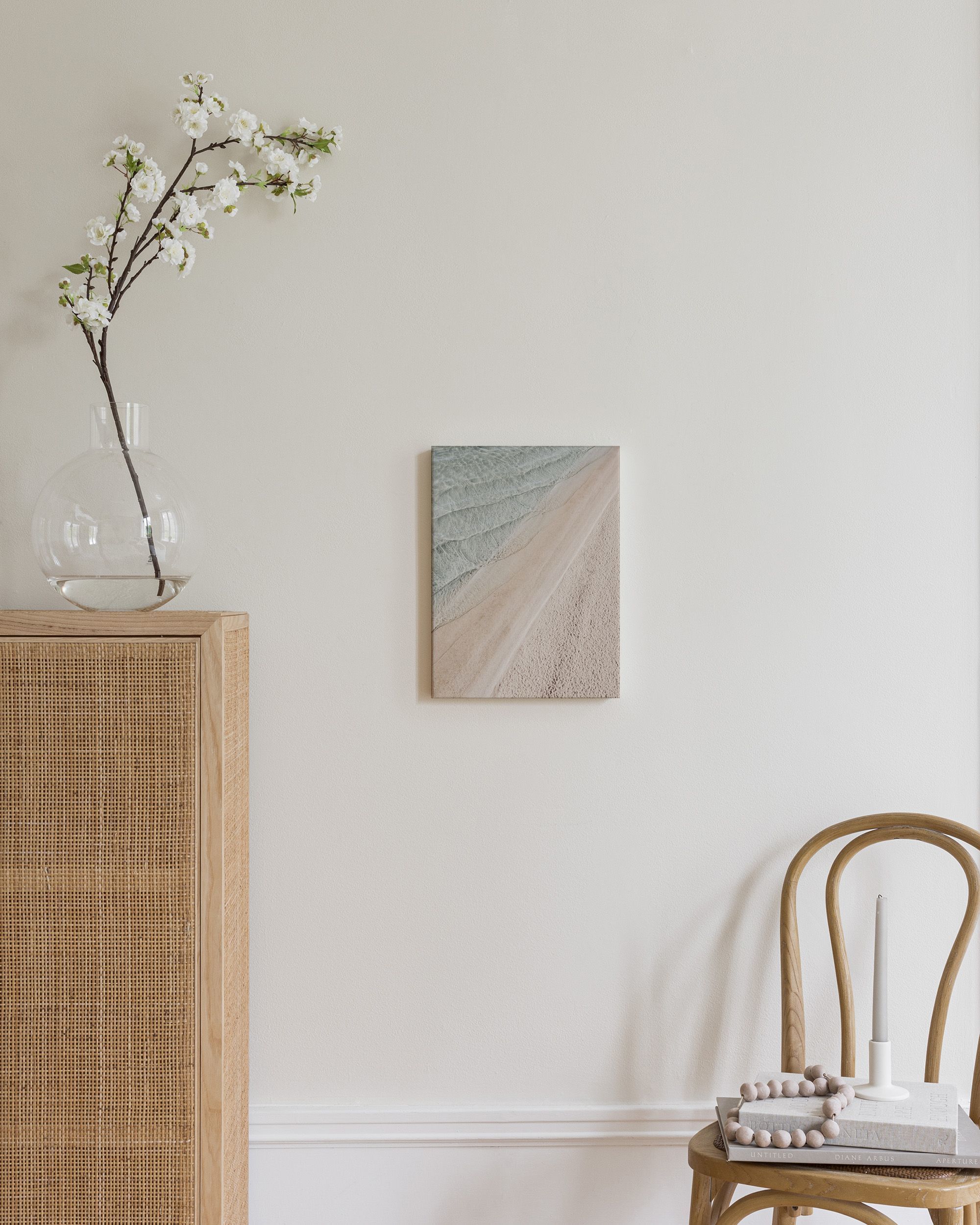 A photo print of clear water meeting a sandy beach. The light blue water creates gentle waves and curved lines on the light beige sand. A calm and natural shoreline with beautiful patterns.
