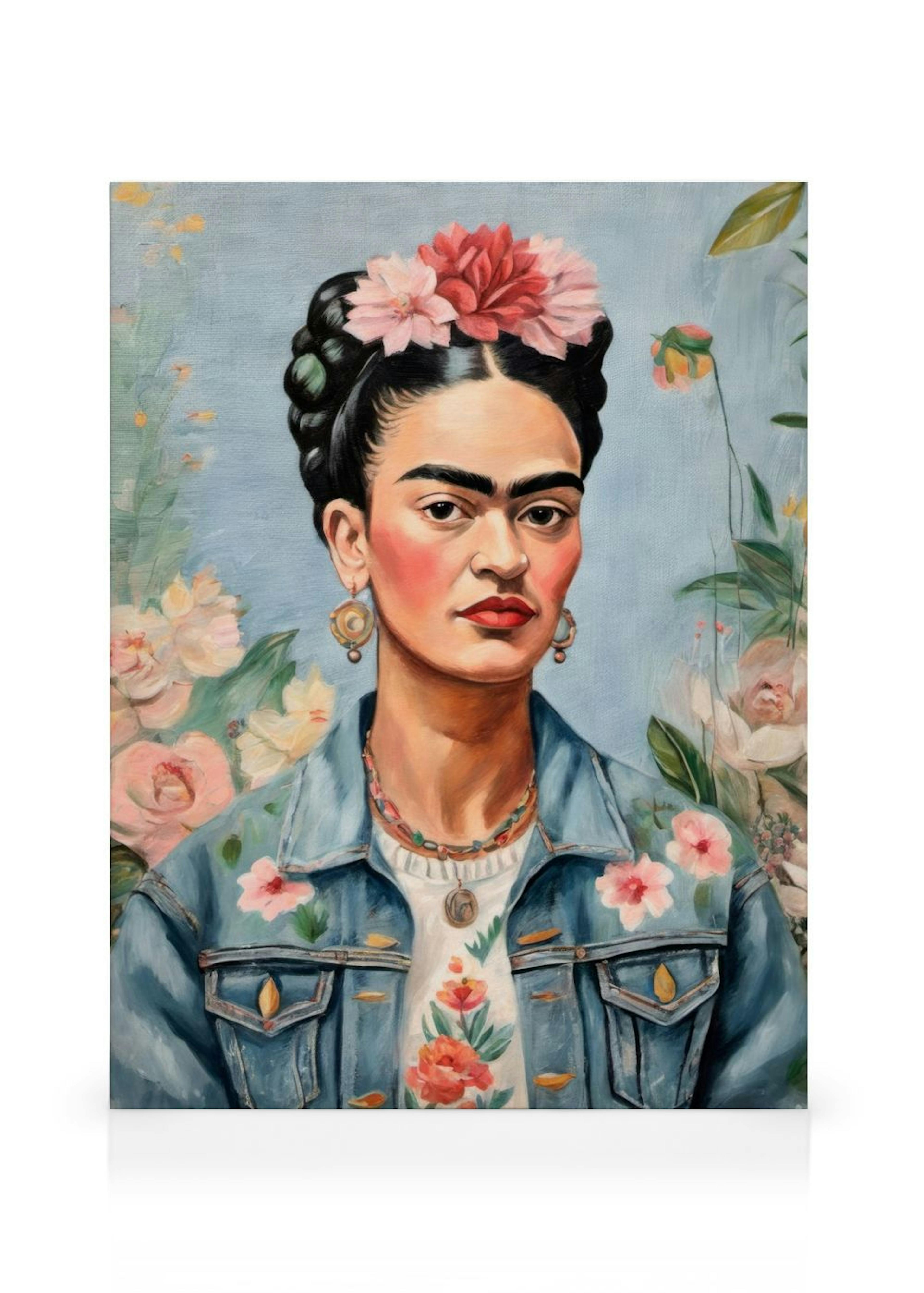 From €3.87A stunning canvas print portrait of Frida Kahlo in a blue denim jacket with floral embroidery on a floral background. Perfect wall art for your gallery wall.