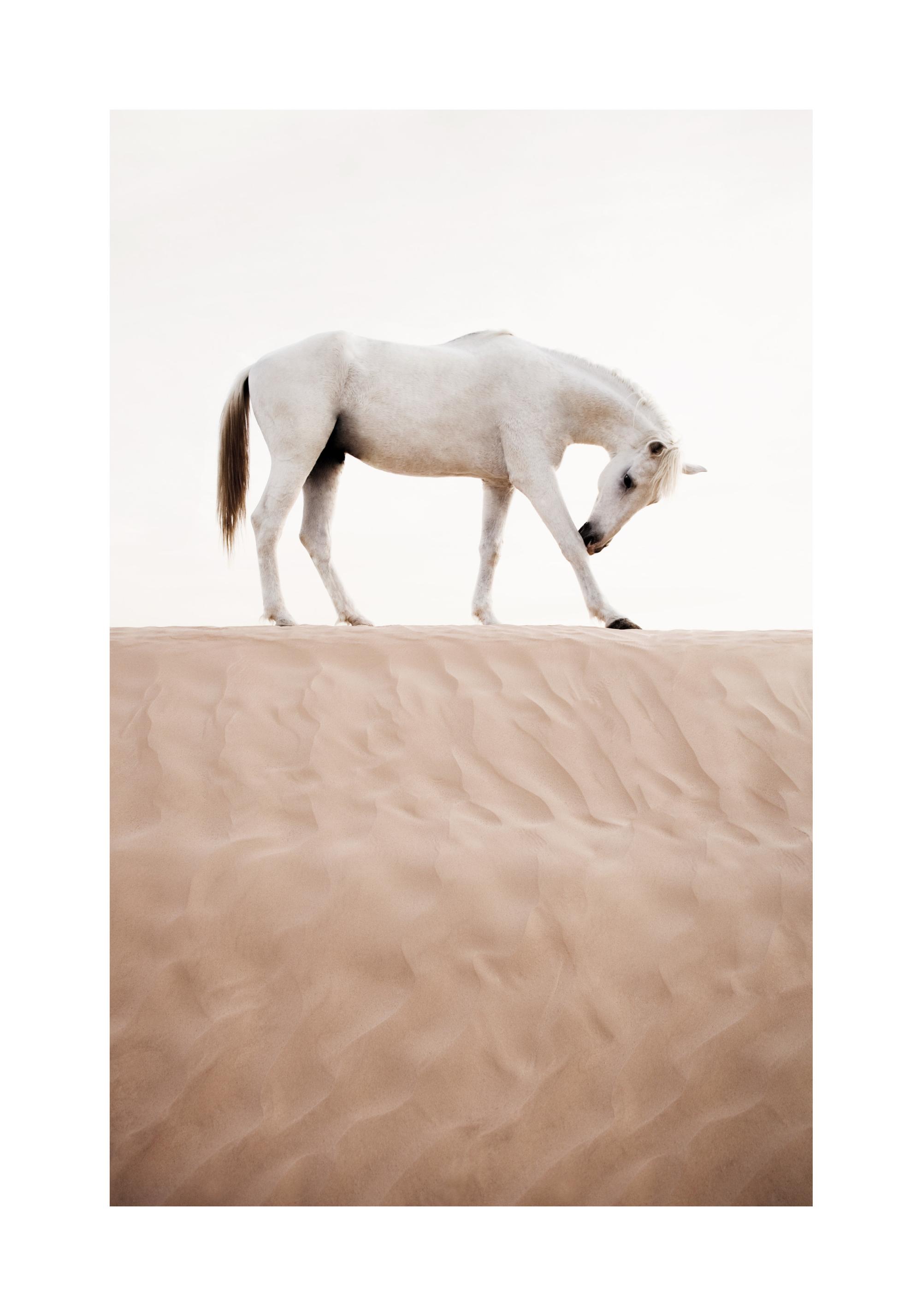 From €7.77A beautiful photographic poster of a white horse in the desert. The white horse scratches its front leg and it looks like the horse is bowing. The white fur of the horse and the beige sand dune form a beautiful colour combination and the colours fit to every living style.