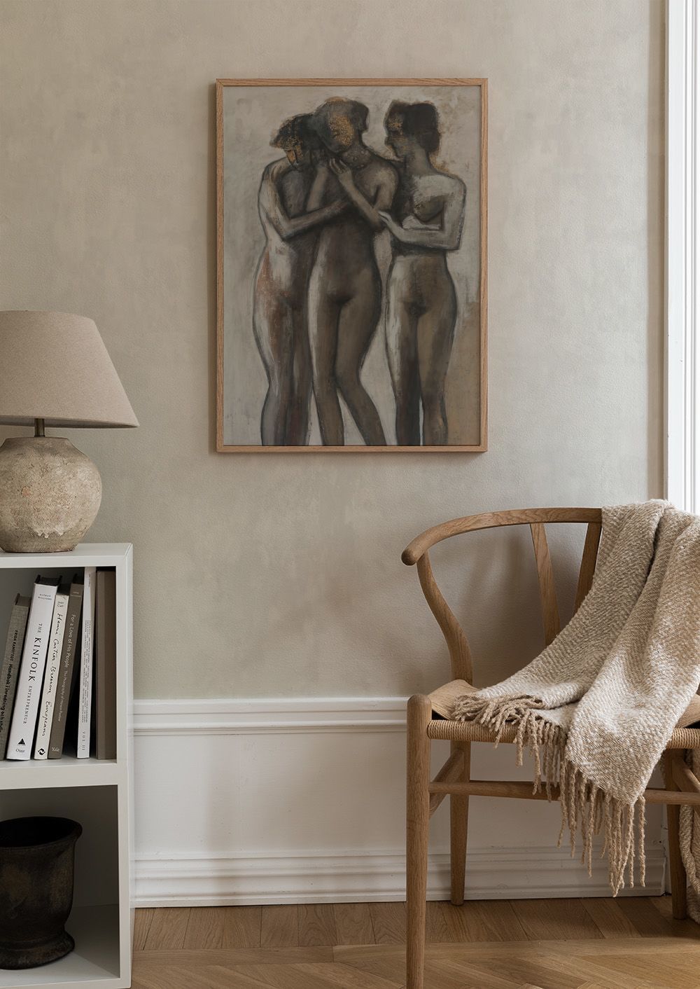 From €12.87A poster with three nude figures standing closely together in earthy tones of brown, black, and gold. The abstract faces feature textured golden accents against a muted beige background.