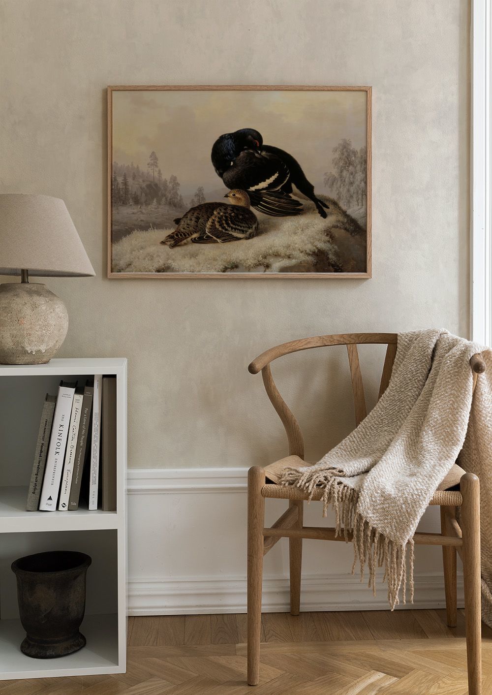 A print of two birds resting on a snowy hill. One bird is black with white and brown markings, the other is brown with speckled patterns. Perfect poster for nature lovers.