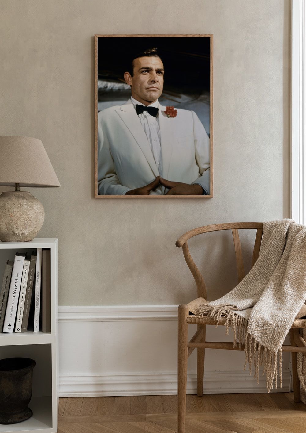 A photo print of a man wearing a white tuxedo with a black bow tie and a red flower on his jacket.