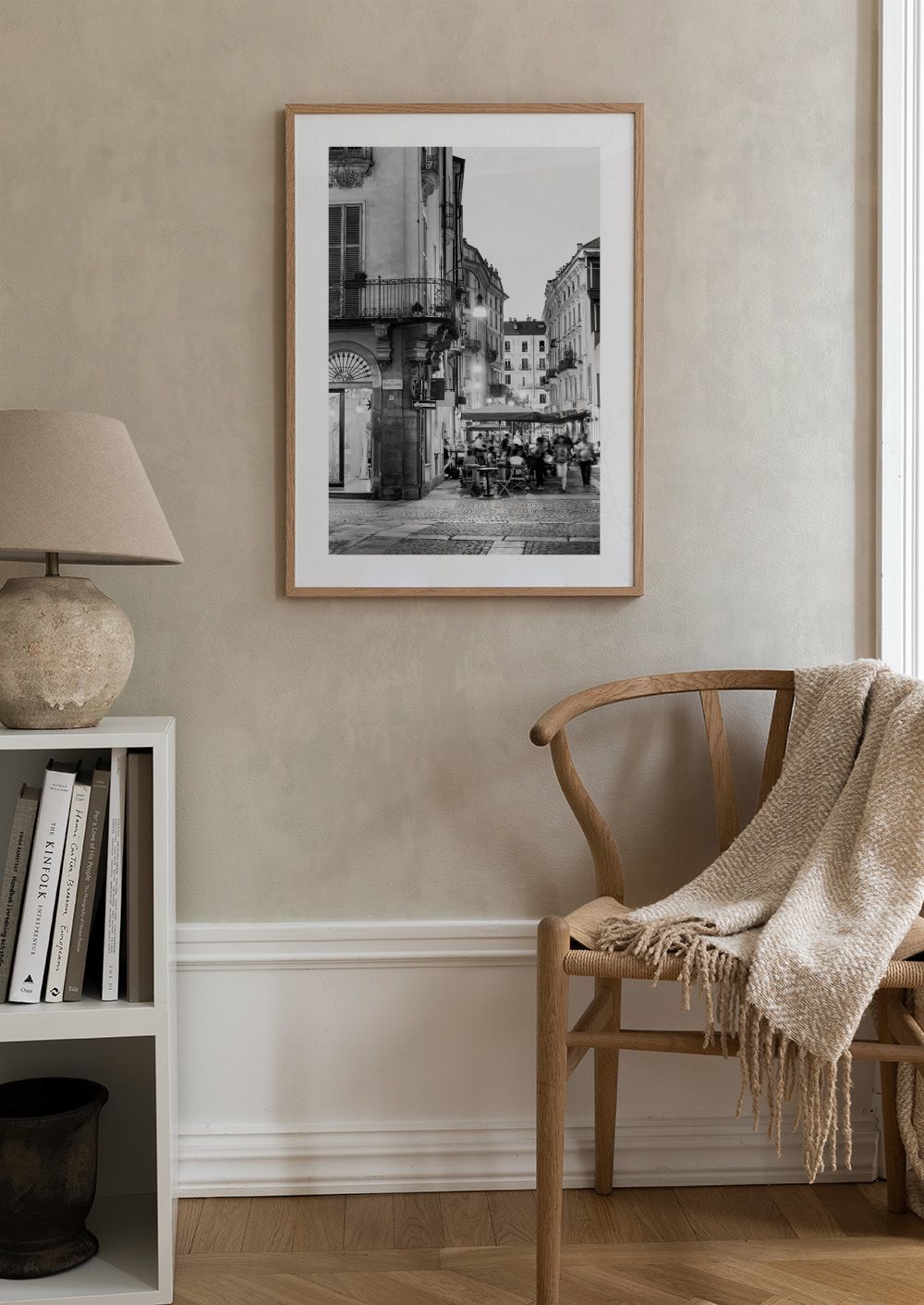 A black and white poster of a charming European street with tall buildings, cobblestones, and people sitting at café tables under umbrellas.