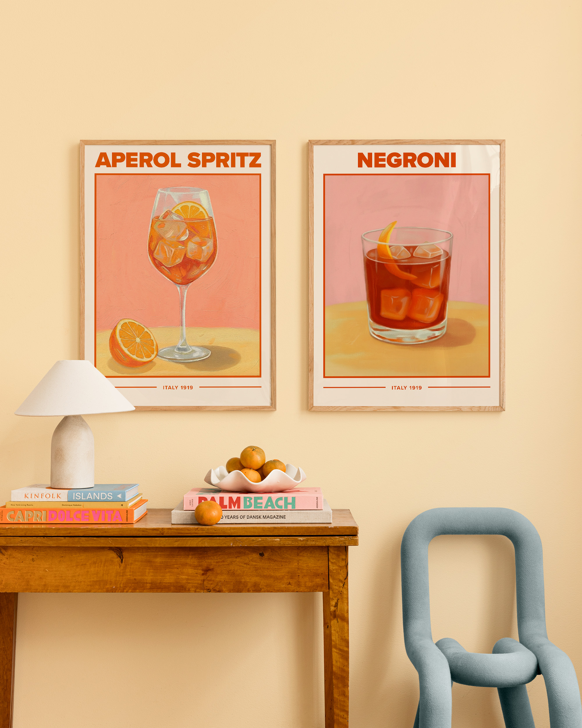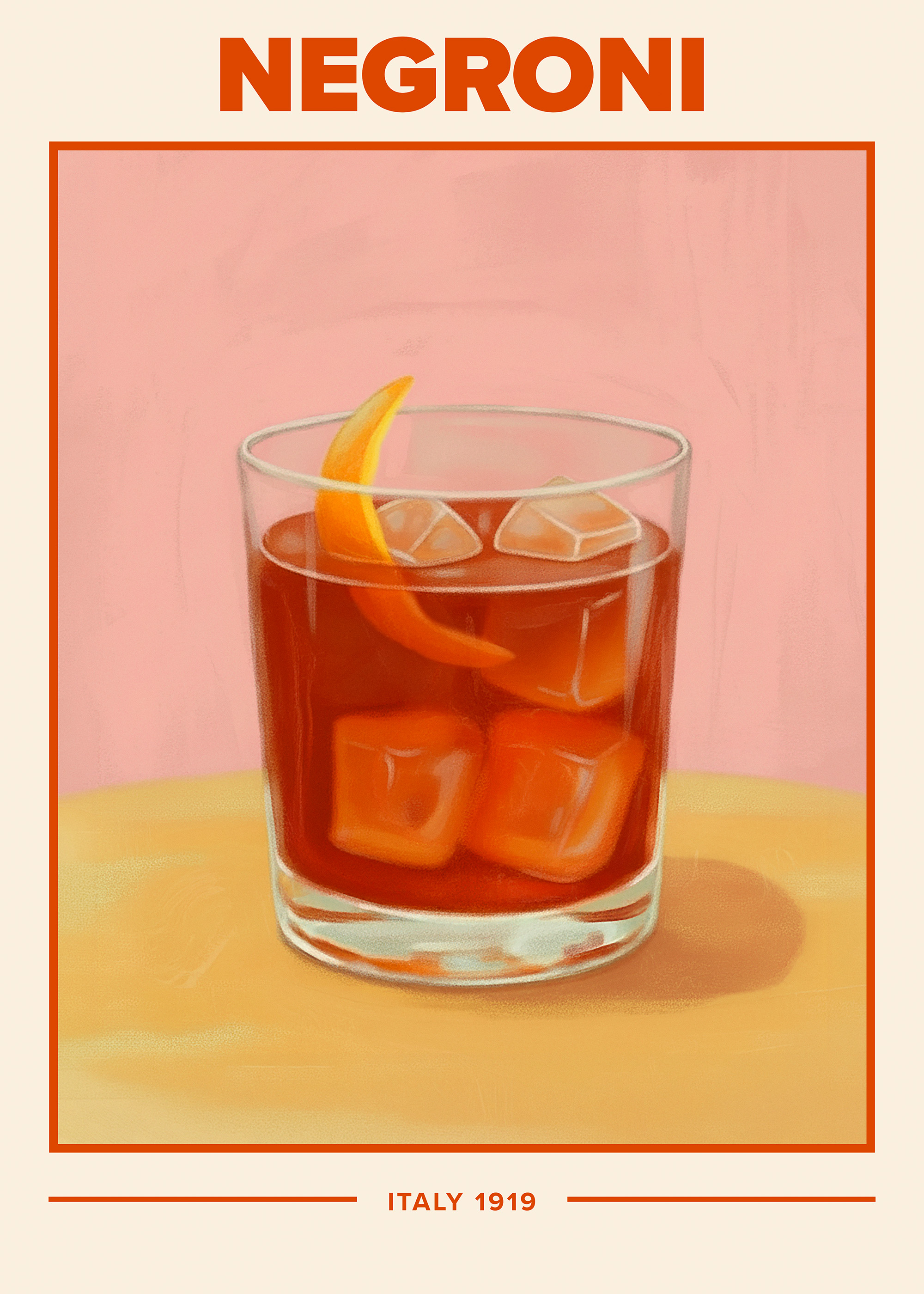 From €12.95Two posters featuring classic Italian cocktails from 1919. One poster shows an Aperol Spritz with orange slices and ice in a wine glass. The other shows a Negroni with ice and an orange peel in a short glass. Perfect wall art for your kitchen!