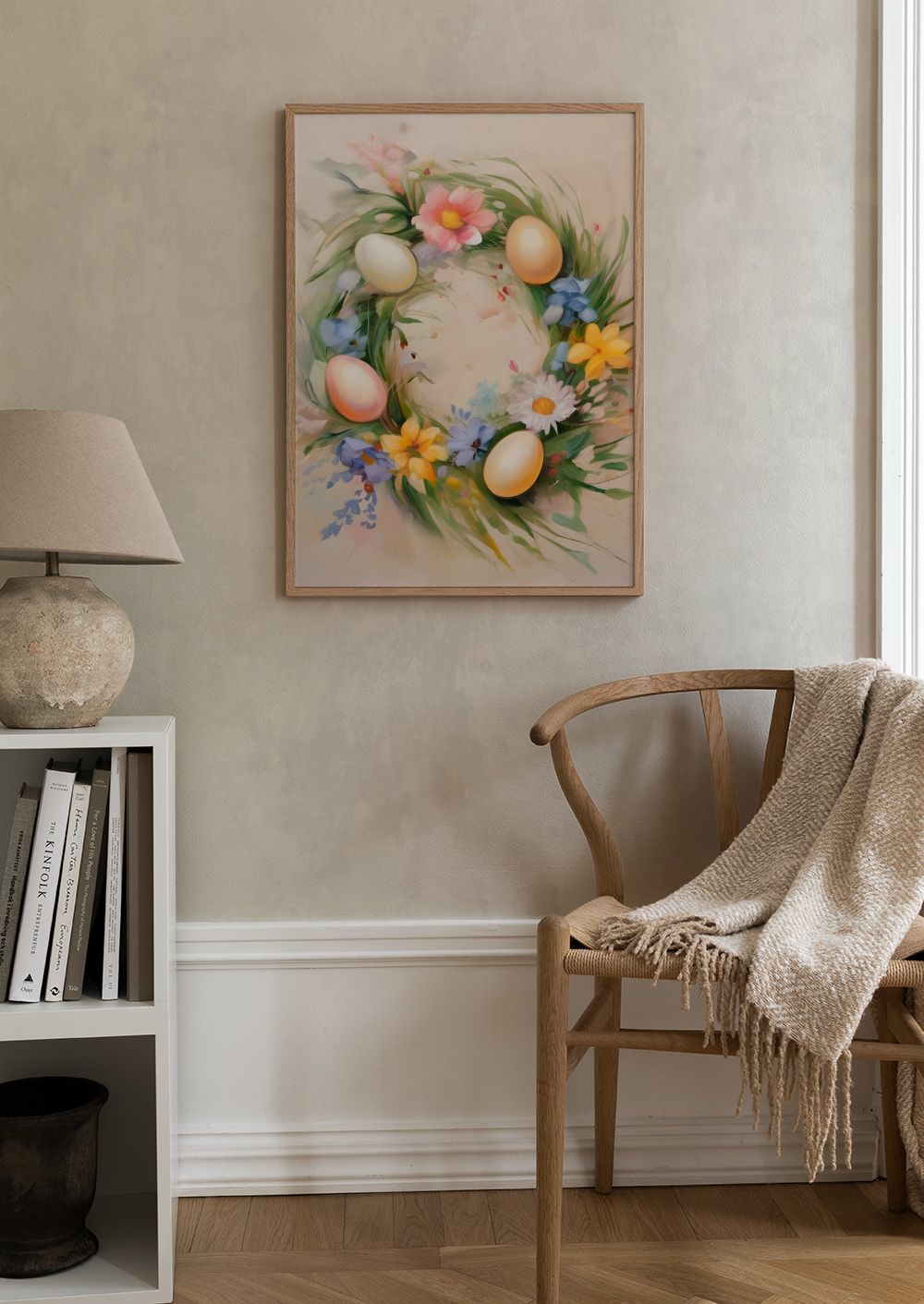 A poster with a wreath of green leaves and colourful flowers in pink, yellow, and blue, surrounding five pastel Easter eggs on a soft background.