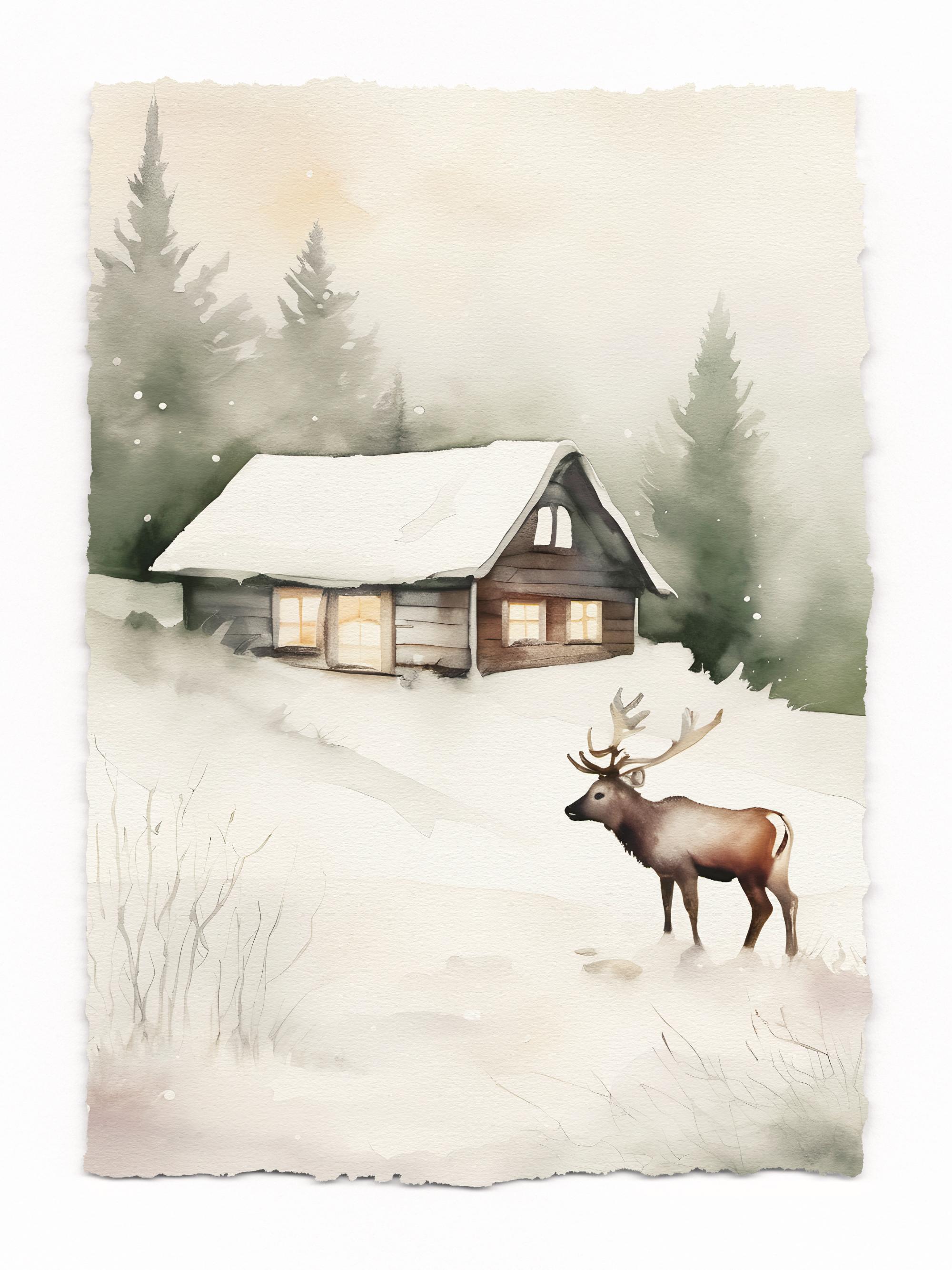 A cosy winter scene showing a wooden cabin in the snow. Pine trees and a reindeer create a peaceful forest setting at night.