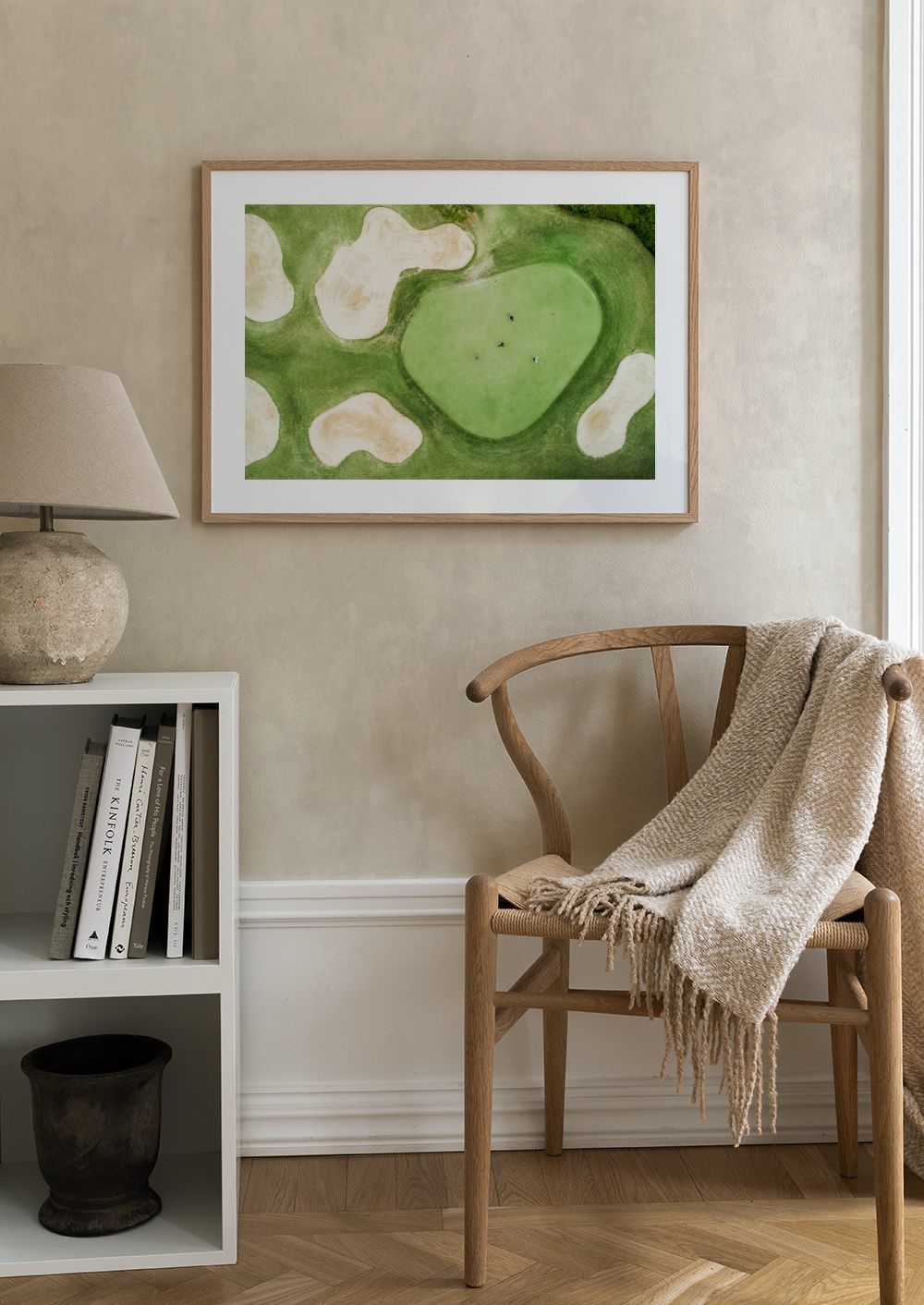 An aerial photo print of a golf course green with sandy patches in beige. Perfect for golf lovers!